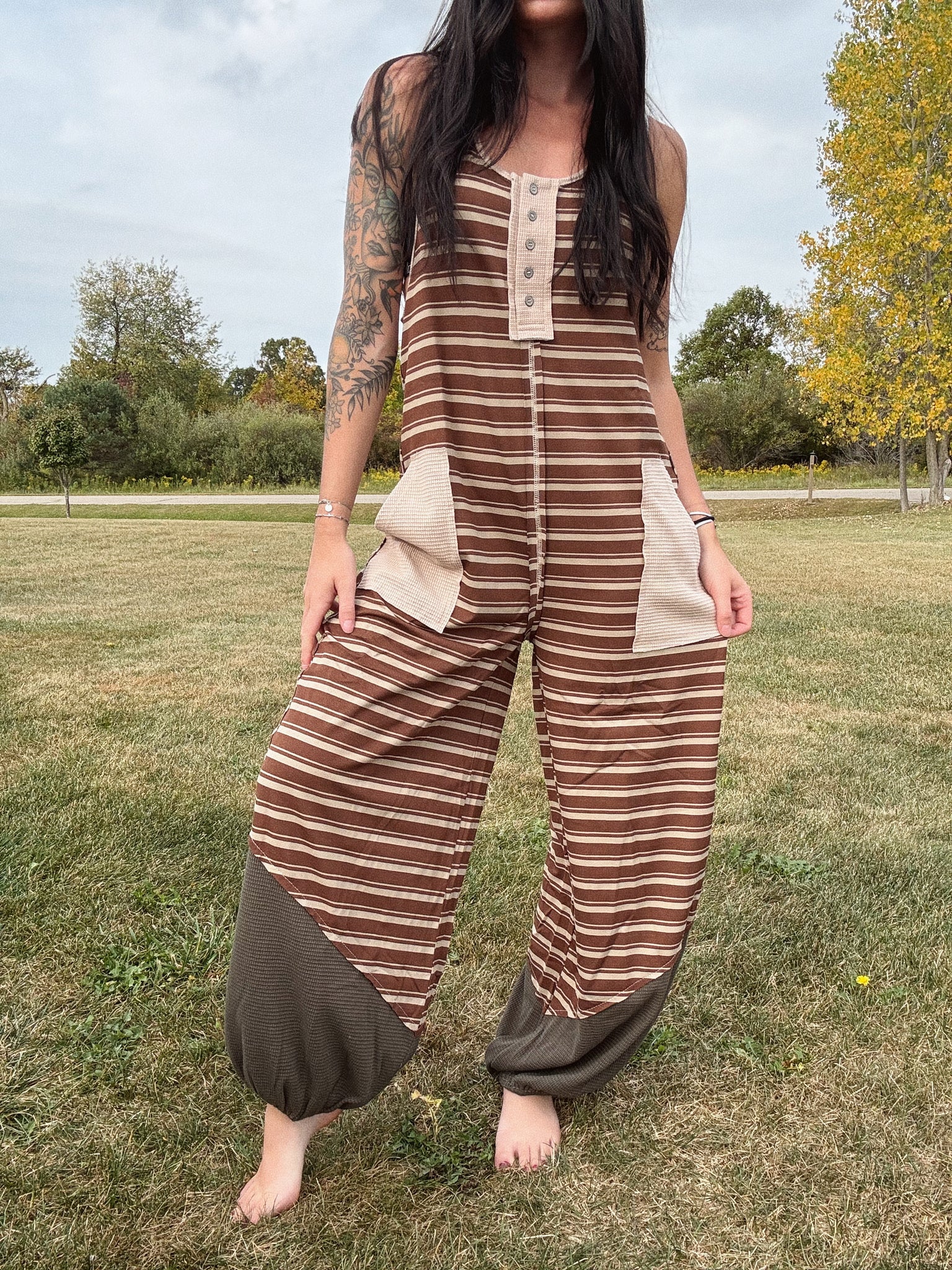 Embrace effortless style with the Lainey Striped Jumpsuit, featuring a loose fit that moves with you all day long. Playful balloon pants add a whimsical touch, while handy front pockets keep essentials close. The classic stripes bring timeless charm to this fun and comfortable outfit perfect for any casual adventure.