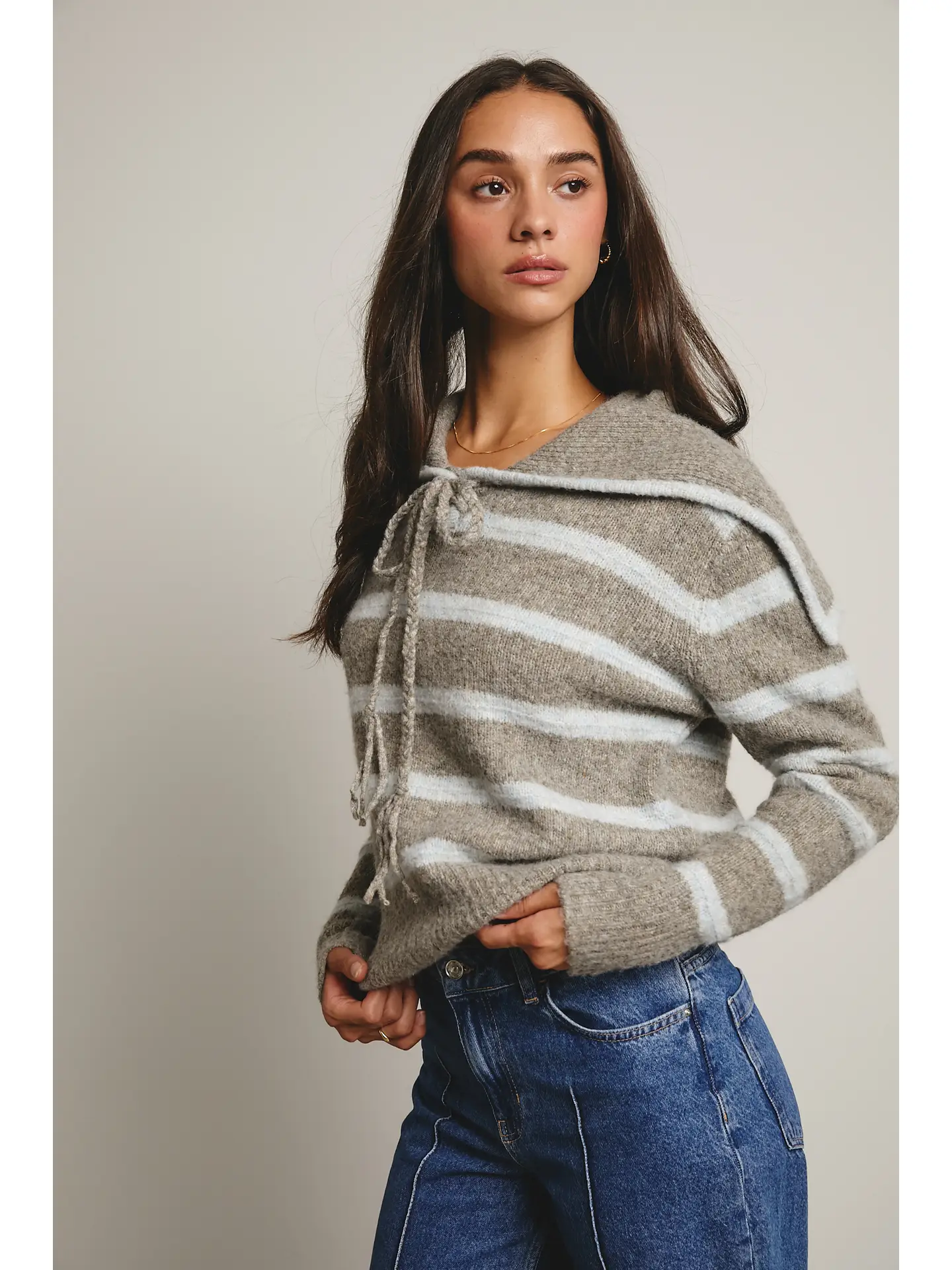 Wrap yourself in cozy charm with this mid-weight knit sweater, featuring a plush fuzzy finish that feels as good as it looks. Soft-toned stripes add visual interest while the standout sailor collar and front tie detail bring a playful, nautical-inspired vibe. Perfect for those days when you want effortless style without sacrificing comfort—this laid-back essential pairs beautifully with everything in your closet.
